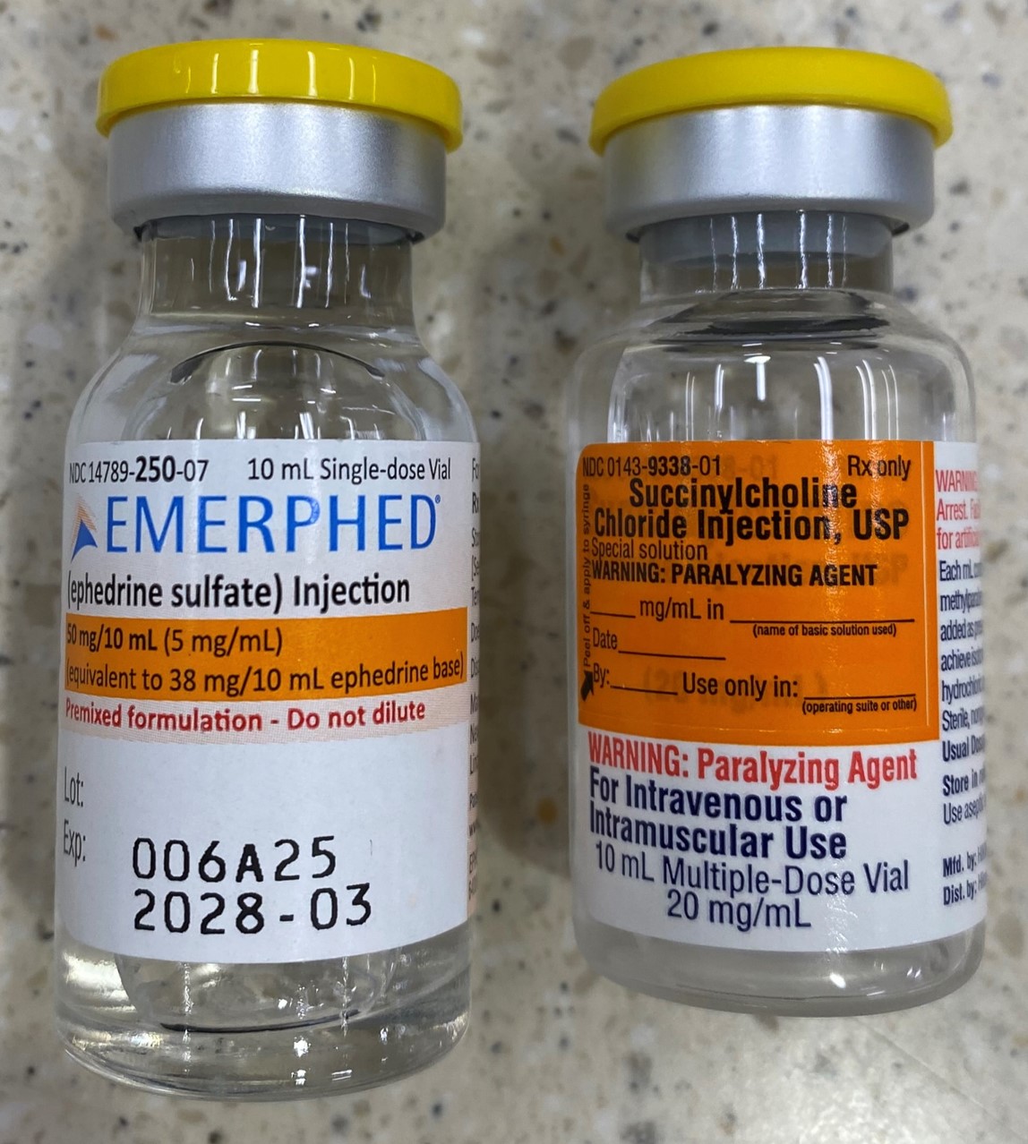 These yellow-capped succinylcholine vials with orange labeling are strikingly similar to ephedrine vials, as shown in the attached photo.